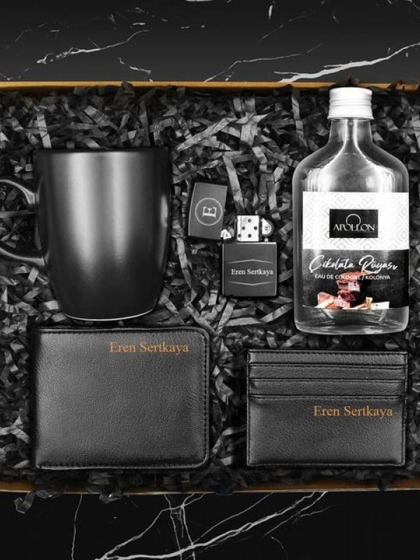 Çikolata Rüyası Kolonya & Siyah Kupa & Kişiye Özel Cüzdan & Zippo Model Çakmak & Kartvizitlik Hediye Seti